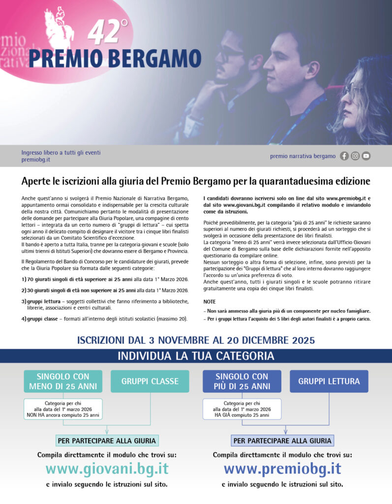 CLICCA QUI per scaricare il Bando Case Editrici per l’edizione 2026 del Premio Bergamo