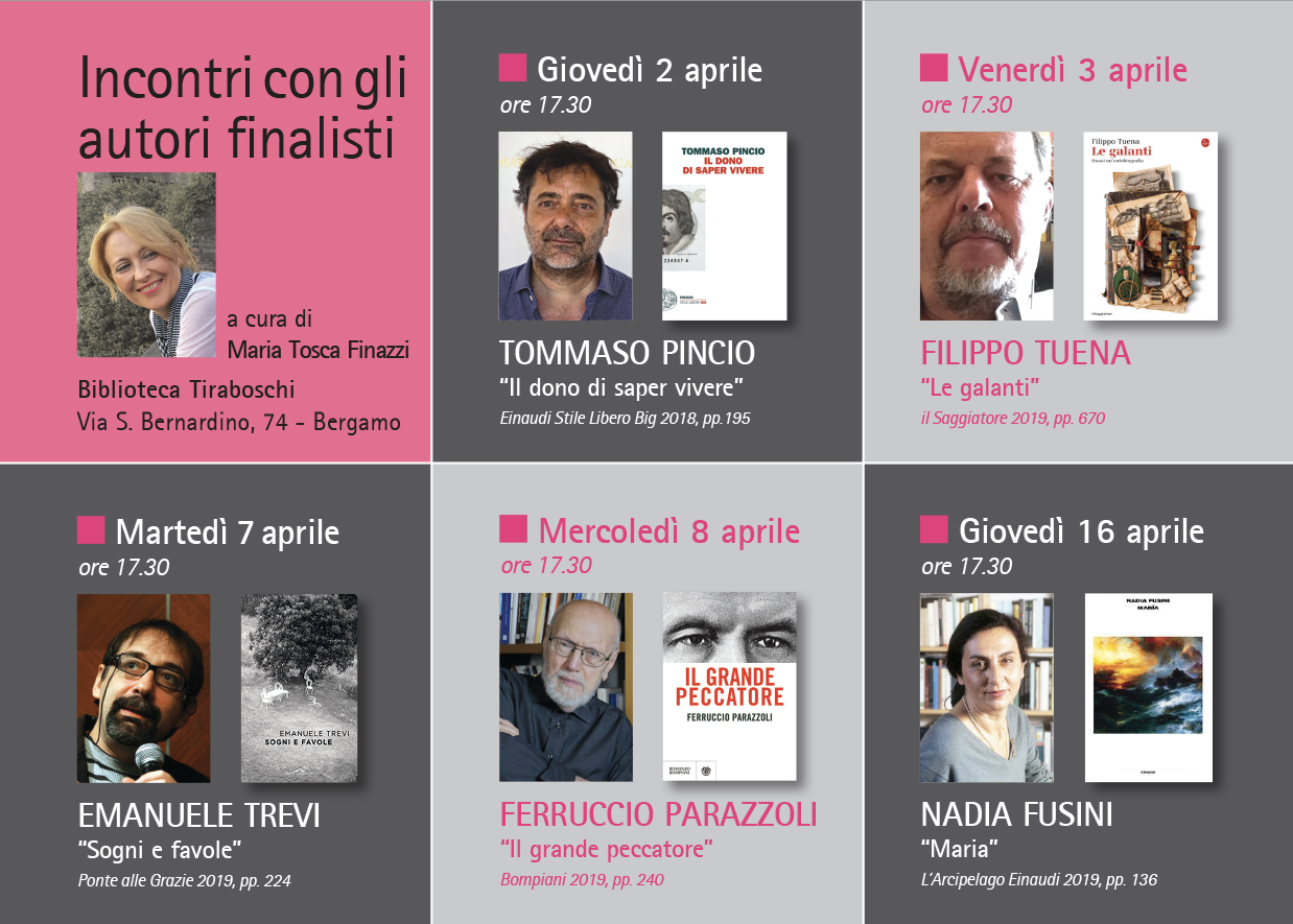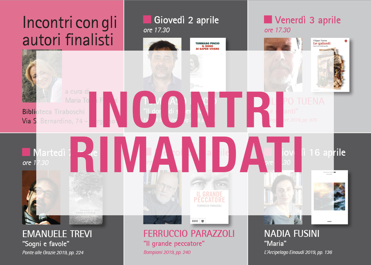 A seguito del protrarsi dei provvedimenti cautelari da coronavirus, e soprattutto dell’impossibilità di ipotizzare previsioni a breve termine, sono annullati tutti gli incontri previsti nel mese di aprile con gli scrittori finalisti della 36°edizione del Premio Nazionale di Narrativa Bergamo 2020.